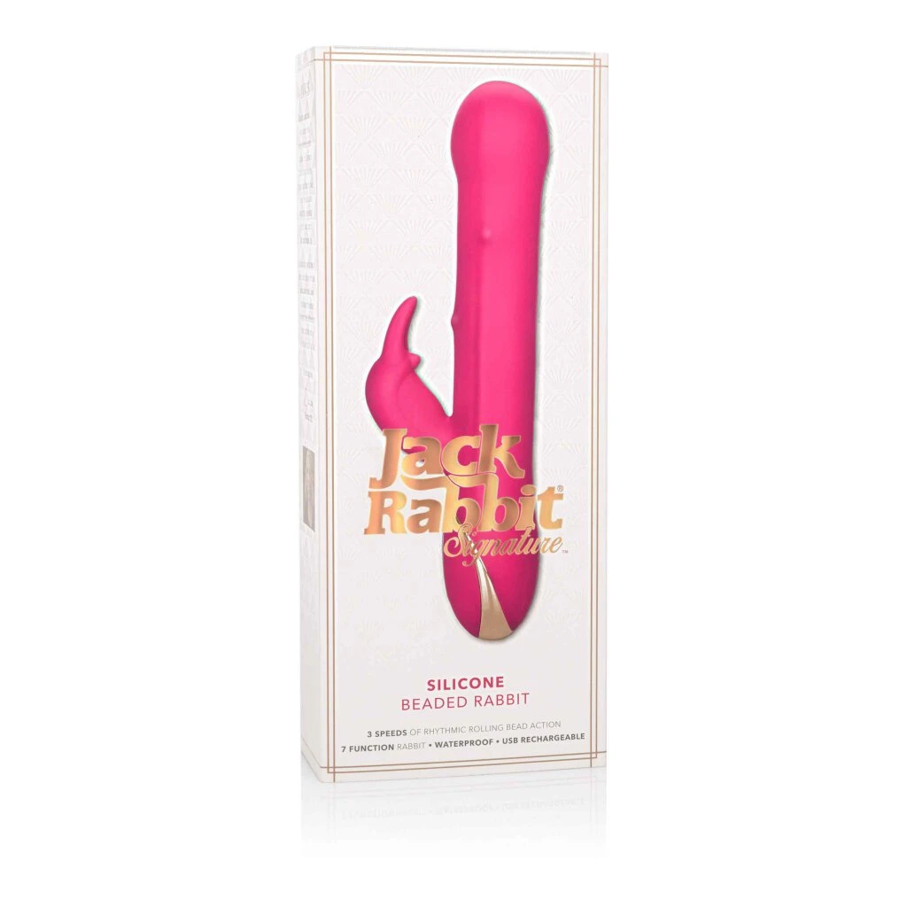 Die aufwändige Jack Rabbit Signature Collection erweckt mit dem sensationellen Silicone Beaded Rabbit Sexspielzeug für Frauen aufregende Fantasien zum Leben. Das wunderschön gestaltete Intim-Massagegerät verfügt über 7 spielerische Vibrationsfunktionen und 3 atemberaubende Geschwindigkeiten der rollenden Lustperlen für ein sinnliches Erlebnis des Lebens. Um Ihr Vergnügen zu maximieren und anzupassen, können Sie mit dem leicht zu bedienenden 3-Tasten-Bedienfeld die Vielzahl der Vibrations- und Lustperlen-Geschwindigkeitsoptionen unabhängig voneinander bedienen, was dieses Sexspielzeug zum besten für Frauen macht.Während der neckische Bunny-Stimulator flackert, laufen die 4 rollenden Lustperlen am Schaft entlang und sorgen für eine aufregende innere Stimulation. Die sinnlich rollenden Perlen haben 3 kraftvolle Geschwindigkeiten, um sicherzustellen, dass Sie immer genau die richtige Stelle erregen. Die flatternden Ohren und die Nase dieses hinreißenden Kaninchens fungieren als unglaublich kraftvoller Klitorisvibrator, der für beglückende Stimulation sorgt. Die sanften, flexiblen Teaser-Vibrationen können unabhängig von der Perlen-Geschwindigkeitsfunktion verwendet werden, um das ultimative, individuell anpassbare Vergnügen zu erleben. Der selbstverschließende Ladeanschluss an der Basis des Sexspielzeugs ermöglicht es Ihnen, Ihre Leidenschaft in 150 Minuten aufzuladen. Benutzen Sie das elegante 3-Tasten-Bedienfeld, um mehr als eine Stunde Vergnügen zu erleben. Warum sich mit dem Rest zufrieden geben, wenn Sie das Beste haben können; holen Sie sich noch heute Ihren eigenen Jack Rabbit von CalExotics! Gesamtlänge: 14 cm / Durchmesser: 3,75 cm / Einführbare Länge: 14 cm / 3 Geschwindigkeitsmodi / 7 Vibrationsmodi / Wasserdicht / USB wiederaufladbar / Material: Silikon