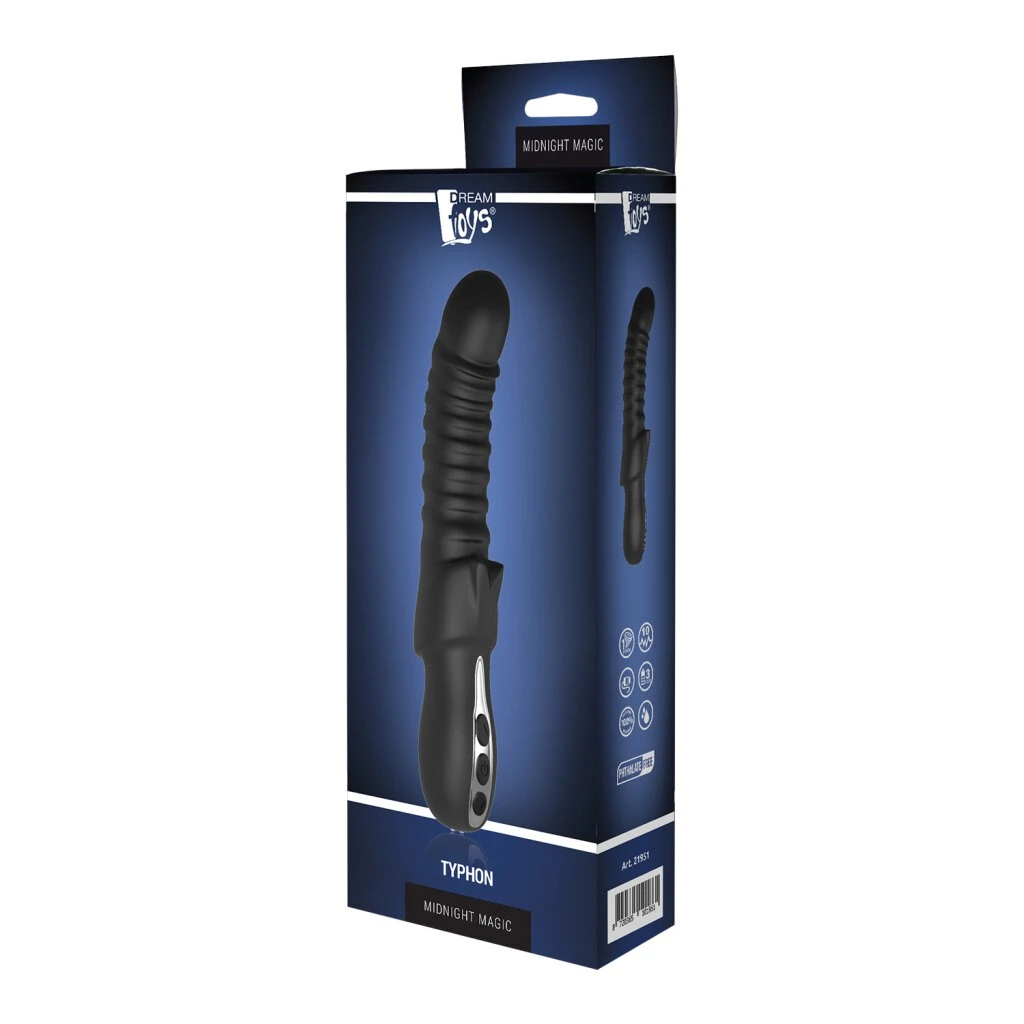 Ganz im Stil der anderen Toys des Labels Midnight Magic ist Typhon ganz schwarz mit einem chromfarbenen Detail an der Basis. Dieser Duo-Vibrator aus Flüssigsilikon fühlt sich seidig weich an und die Knöpfe sind in ihrem metallbeschichteten ABS-Knopfbereich leicht zu finden. Typhon hat eine weiche Spitze und einen gebogenen Schaft mit spürbaren, stimulierenden Rillen, die perfekt sind, um den G-Punkt zu erreichen. Die V-Form an der Basis des Schafts ist ein subtiler, wiegender Klitoris-Stimulator. Mit seinem leistungsstarken Motor ist dieser Duo-Vibrator sicher, starke Vibrationen sowohl im Schaft als auch im Klitoris-Stimulator zu liefern und mit 7 Vibrationsrhythmen und 3 Geschwindigkeiten gibt es eine perfekte Vibration für jeden Geschmack. Zögern Sie nicht, Typhon in der Badewanne oder unter der Dusche zu benutzen, denn er ist 100% wasserdicht. Ein magnetisches USB-Kabel zum Aufladen ist im Lieferumfang enthalten. Aufladedauer 3 Stunden. Nutzungsdauer 60 Minuten bei höchster Geschwindigkeit. Körperverträglich, frei von Phthalaten und Latex.
