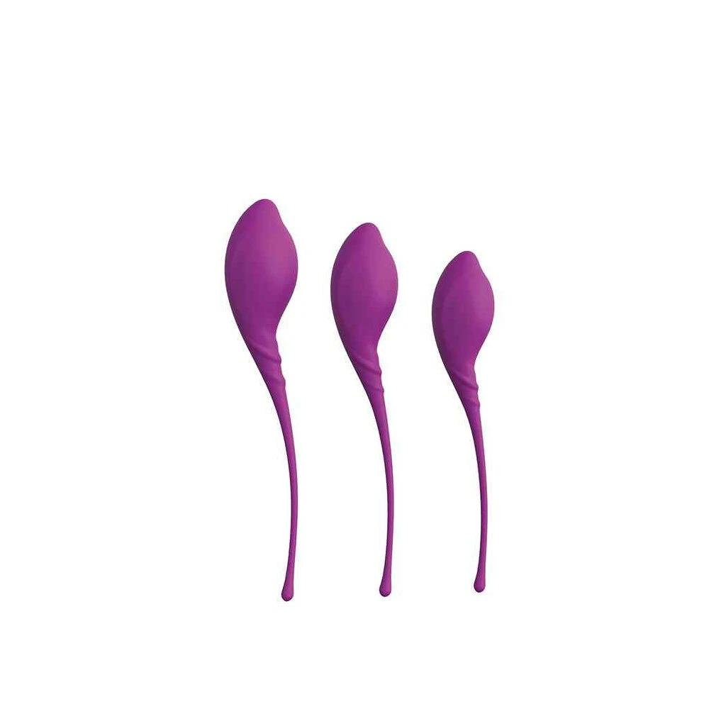 Ein Set aus 3 Lustkegeln, jeder mit einer anderen Größe und einem anderen Gewicht, jeder mit einem praktischen Zugband. Dieses Set ist perfekt für ein Beckenbodentraining in 3 Phasen, die gleichzeitig ein intensives Vergnügen bieten. Beginnen Sie mit dem größten, leichtesten und fahren Sie später mit den kleineren, schwereren fort, um die Vaginalmuskeln zu stärken und zu straffen. Verbessern und erhalten Sie die Darm- und Blasenfunktion. Beginnen Sie die Übungen mit dem leichtesten Kegel, der der größte ist. Nach einigem Training werden Sie in der Lage sein, die schwereren und kleineren Kegel zu halten und zu pressen.