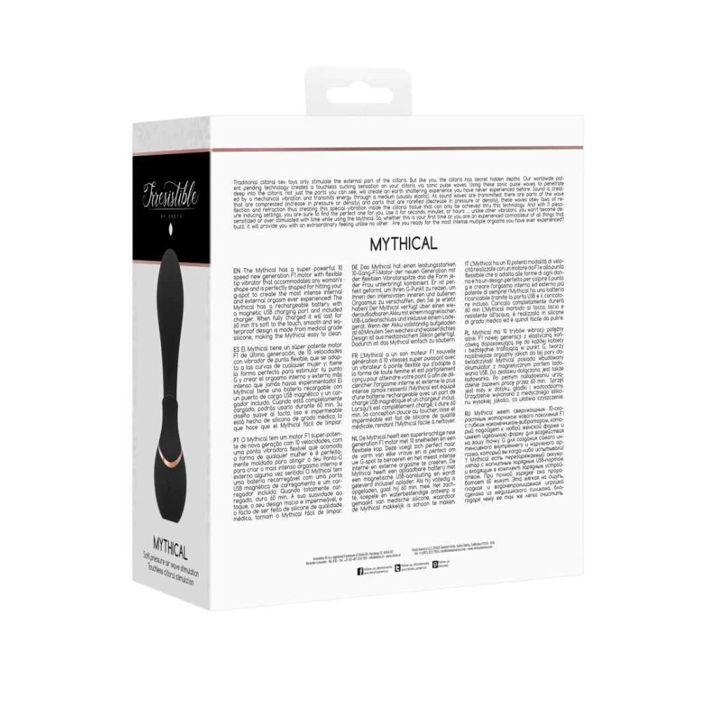Der Mythical hat einen superstarken F1-Motor der neuen Generation mit 10 Geschwindigkeiten und einer flexiblen Spitze, die sich jeder Frauenform anpasst und perfekt geformt ist, um dein G-Punkt zu treffen und den intensivsten inneren und äußeren Orgasmus zu erzeugen, den du je erlebt hast! Der Mythical hat einen wiederaufladbaren Akku mit einem magnetischen USB-Ladeanschluss und einem mitgelieferten Ladegerät. Wenn er voll aufgeladen ist, läuft er 60 Minuten. Das weiche, glatte und wasserdichte Design ist aus medizinischem Silikon gefertigt, wodurch der Mythical leicht zu reinigen ist.