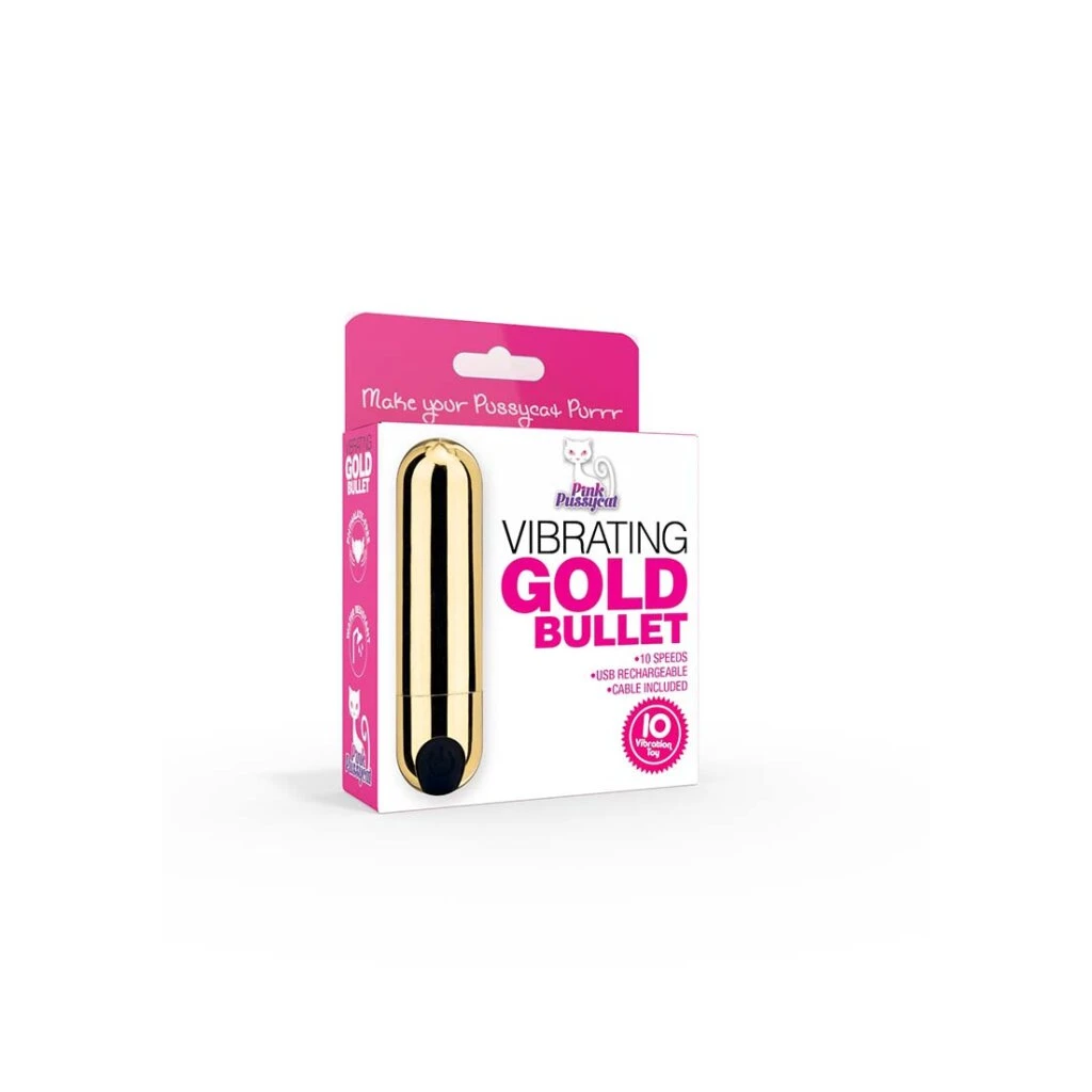 Pink Pussycat Gold Bullet Vibrator von der Cousins Group. Bringt deine Miezekatze zum Schnurren. Vibrierender Gold Bullet Vibe. 10 Geschwindigkeiten. Wiederaufladbar über USB. Inklusive USB-Kabel.