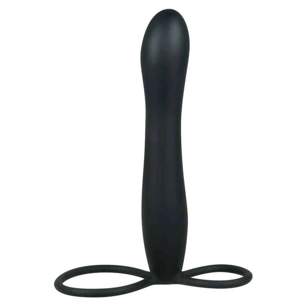 Schwarzer Analdildo mit zwei Schlaufen für die gleichzeitige Befestigung an Penis und Hoden. Gesamtlänge ca. 15 cm, Ø ca. 1,9 bis 2,5 cm. Schwarz. Material: Silikon.