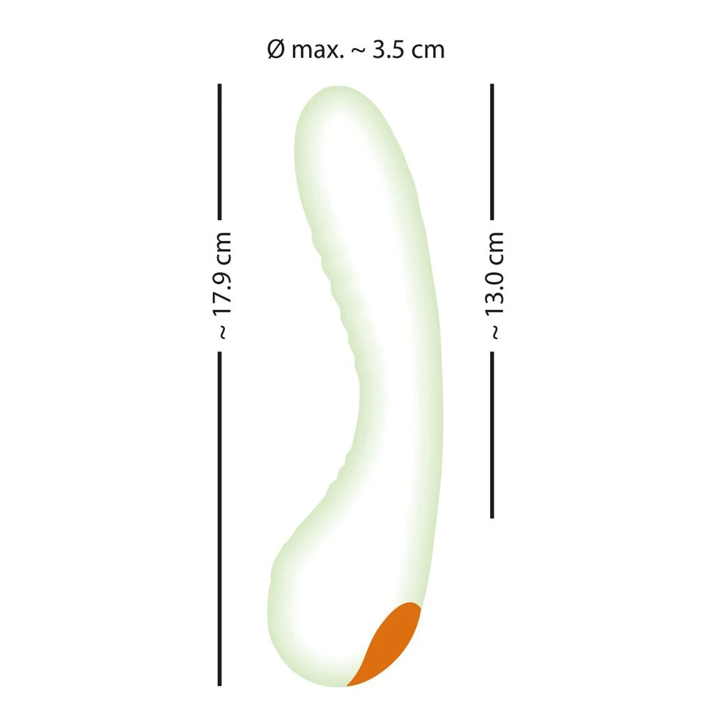 Ideal gebogen ist der rillenstrukturierte Leucht-Vibrator nicht nur zur G-Zonen-Stimulation geeignet. Seine abgerundete Spitze eignet sich auch perfekt zur Stimulation aller äußeren Lustpunkte und der analen Region. Ein echtes Highlight beim Solo- und Liebesspiel in geheimnisvoller Dunkelheit!